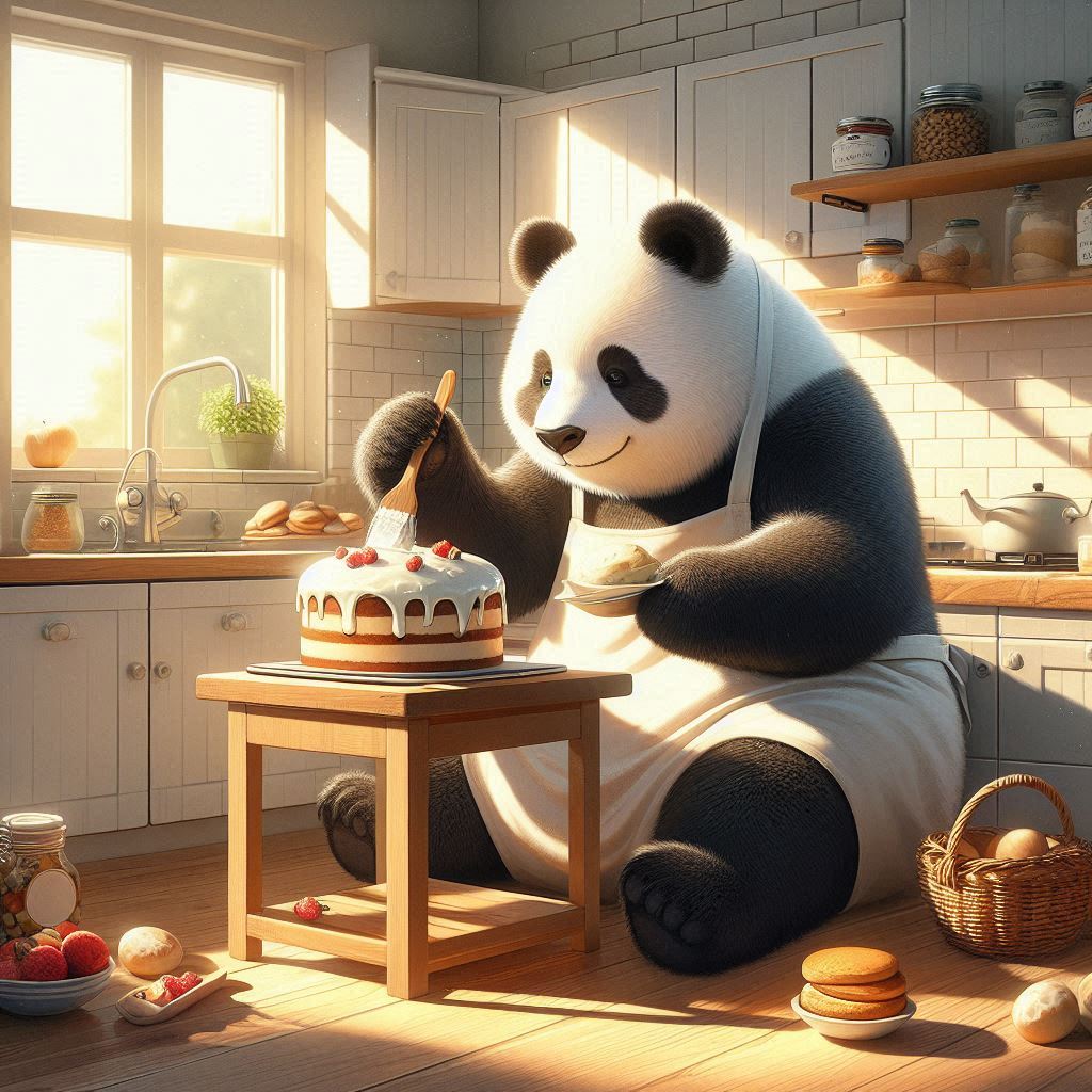A panda wearing an apron decorates a cake with a brush in a sunny kitchen.