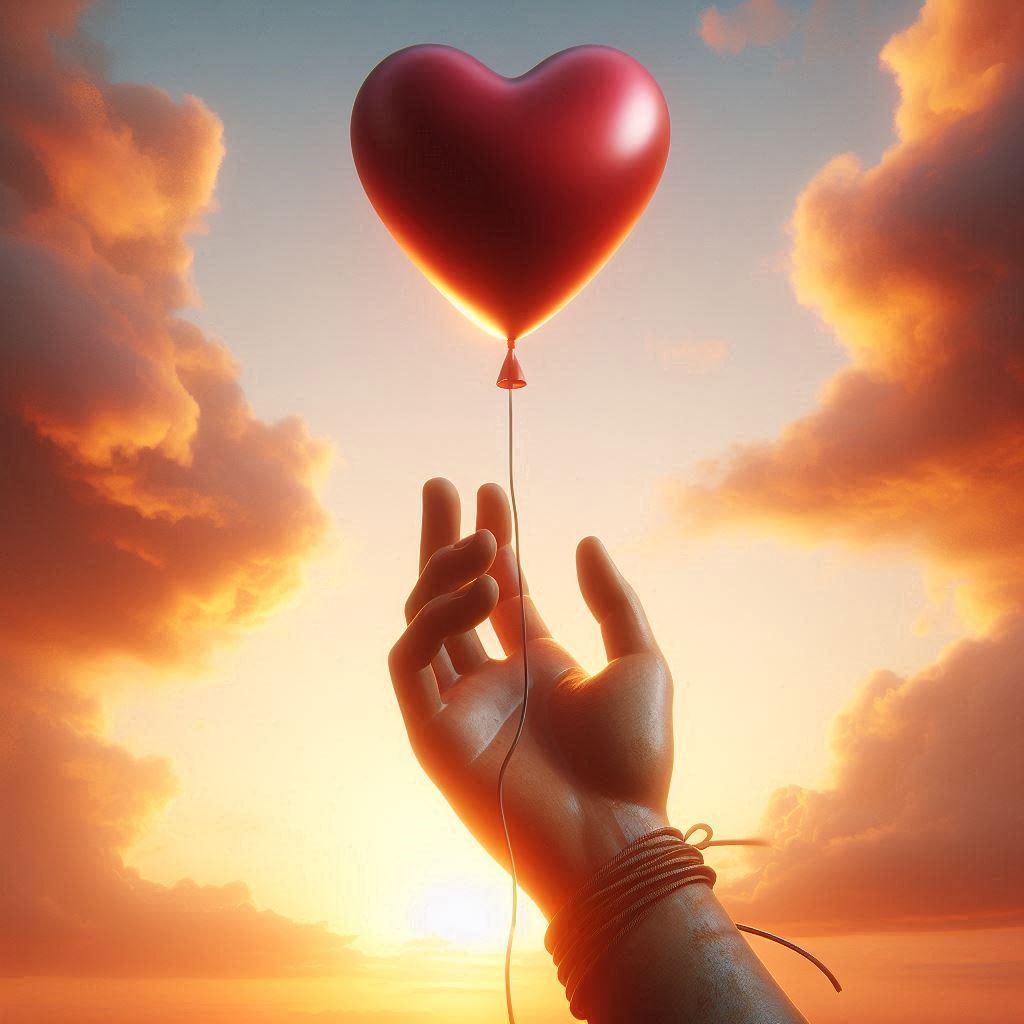 A hand releases a heart-shaped balloon into the sky at sunset.