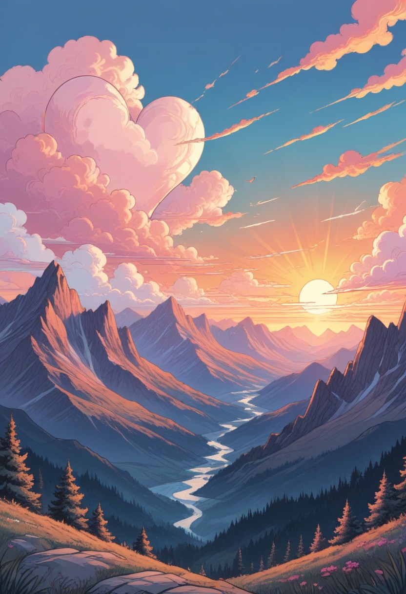 art, beautiful, clouds, digital, heart, illustration, landscape, love, mountains, nature, peace, picturesque, river, romance, scenic, serene, sky, sun, sunset, valley
