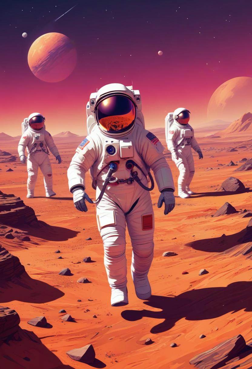 Three astronauts in spacesuits walk across the red, rocky surface of Mars.