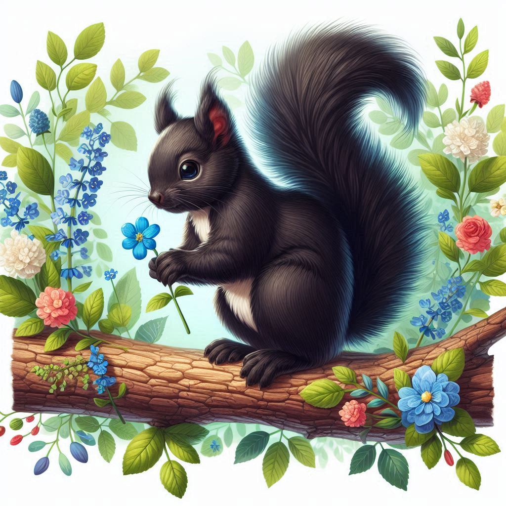 A black squirrel sits on a tree branch, holding a blue flower. The branch is surrounded by green leaves and colorful flowers.