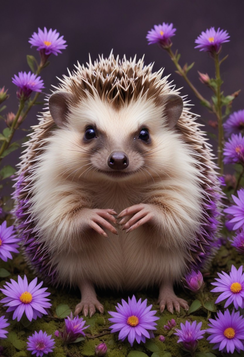 adorable, animal, closeup, cute, eyes, flowers, fur, garden, hedgehog, macro, mammal, nature, nose, paws, purple, small, spiky, spring, wild, wildlife