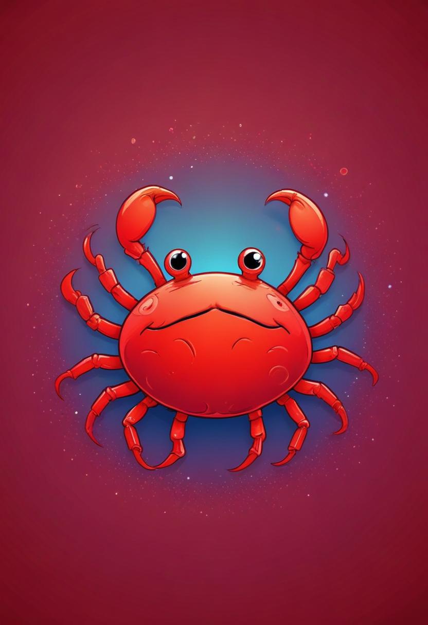 A cartoon crab with big eyes and a red shell sits on a red background with a blue, starry circle around it.