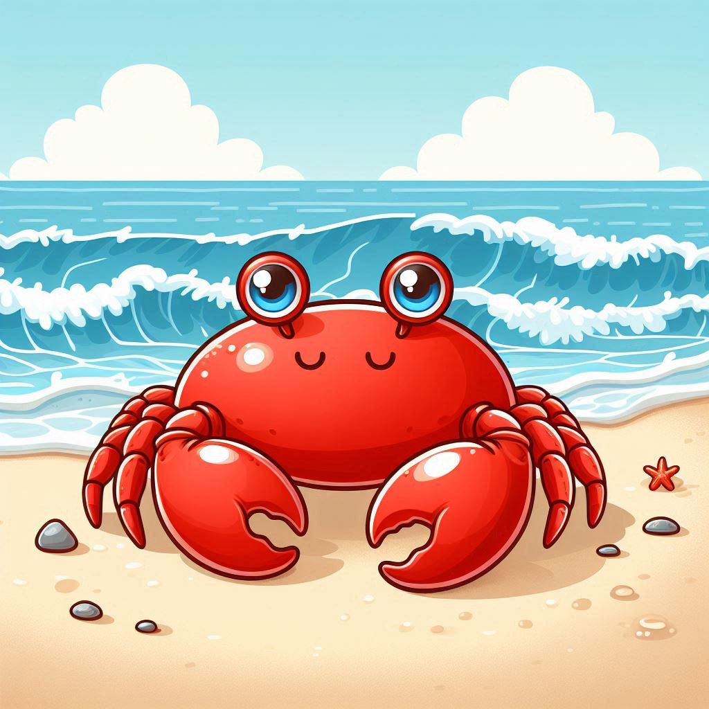 A cartoon crab with a big smile sits on a sandy beach with ocean waves in the background.