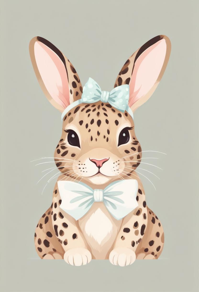 A cute cartoon bunny with a leopard print coat and a light blue bow sits in front of a gray background.