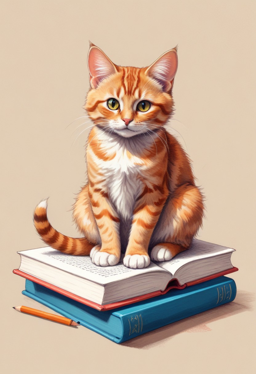adorable, animal, art, book, books, cat, cute, domestic, education, feline, illustration, kitty, learning, orange, pencil, pet, reading, sitting, stack, tabby
