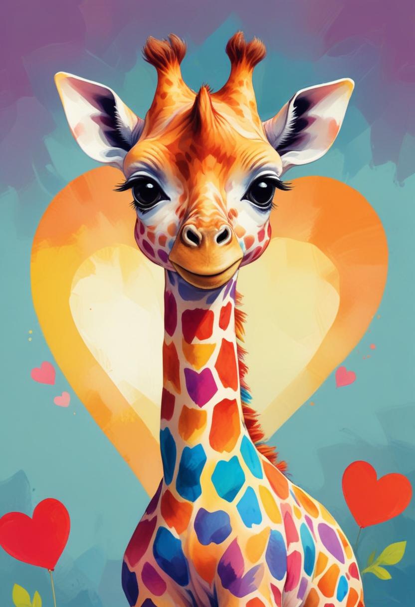 A colorful giraffe with large eyes and a bright smile stands in front of a heart-shaped background.