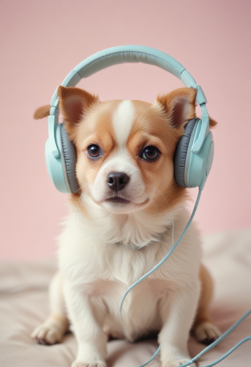 adorable, animal, background, bed, blue, canine, cute, dog, furry, happy, headphones, listening, music, pet, pink, playful, puppy, sitting, small, white