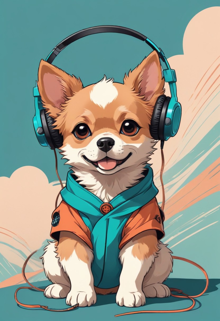 animal, art, blue, brown, canine, cartoon, cute, digital, dog, drawing, ears, happy, headphones, illustration, listening, music, pet, puppy, smile, white