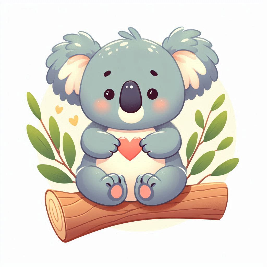 A cartoon koala sits on a branch, holding a pink heart. The koala is smiling and surrounded by green leaves.