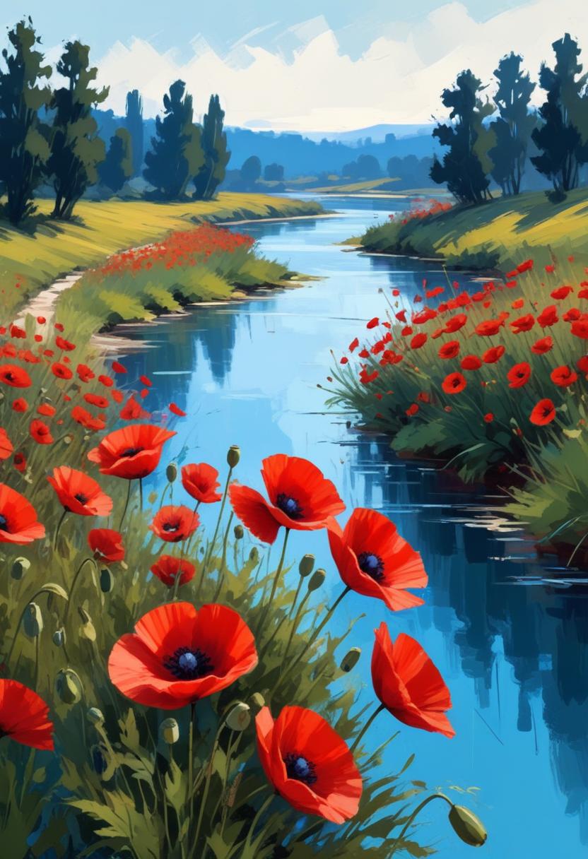 art, beauty, blue, bright, field, flower, foliage, green, landscape, nature, outdoors, painting, poppy, red, reflection, river, scenery, sky, summer, water