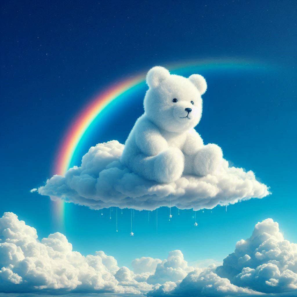 A white teddy bear sits on a fluffy cloud with a rainbow in the background.