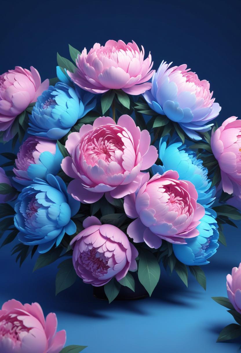 A bouquet of pink and blue peonies with green leaves sits on a blue background.