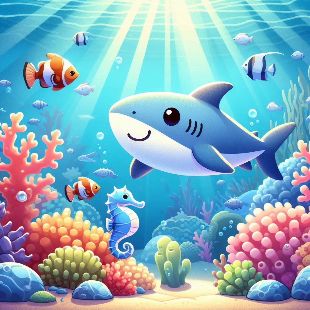 A cartoon shark swims near the ocean floor with other sea creatures and coral reefs.