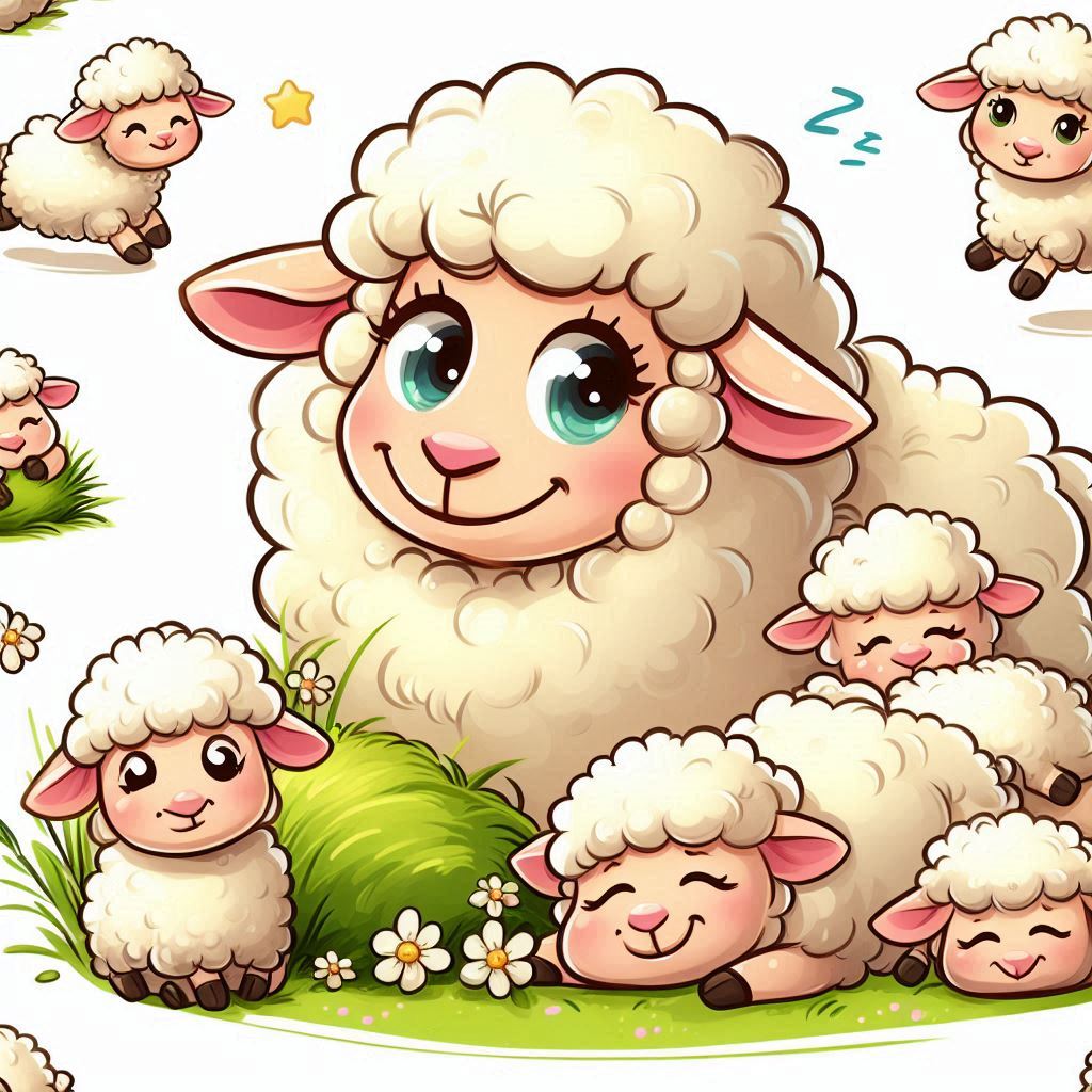 animal, baby, cartoon, cute, drawing, farm, field, fluffy, grass, green, happy, illustration, lamb, mother, nature, relax, sheep, sleep, smile, white