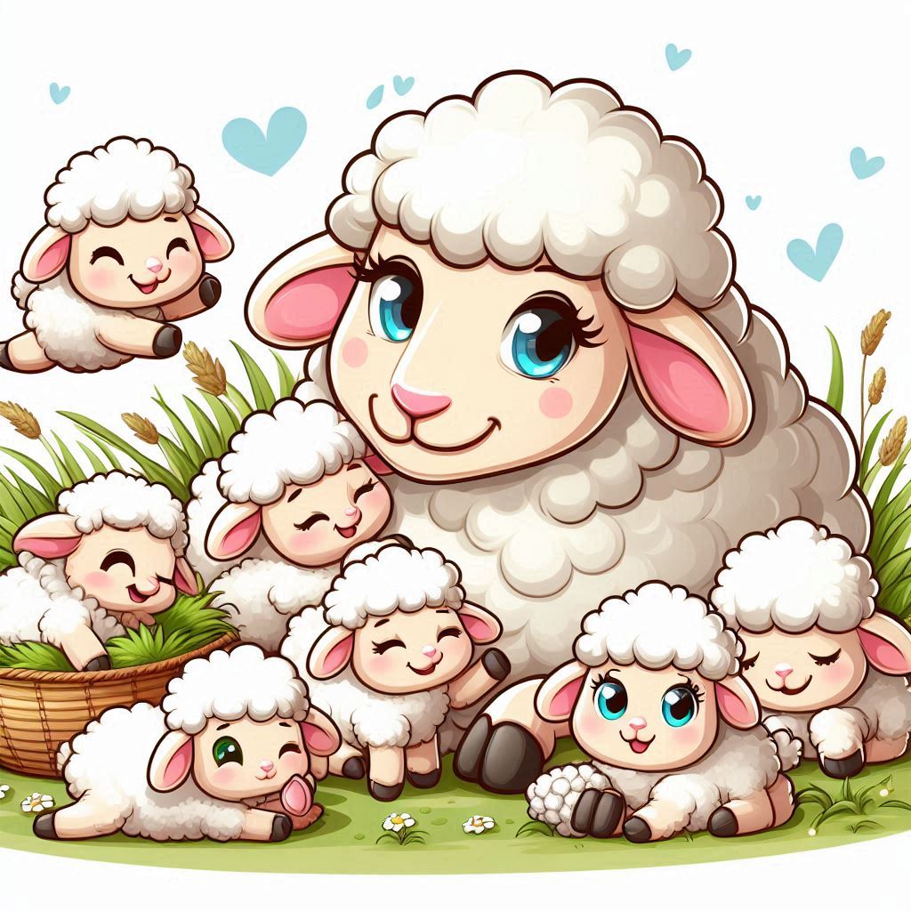 A cartoon mother sheep sits in a grassy field with six adorable baby lambs.