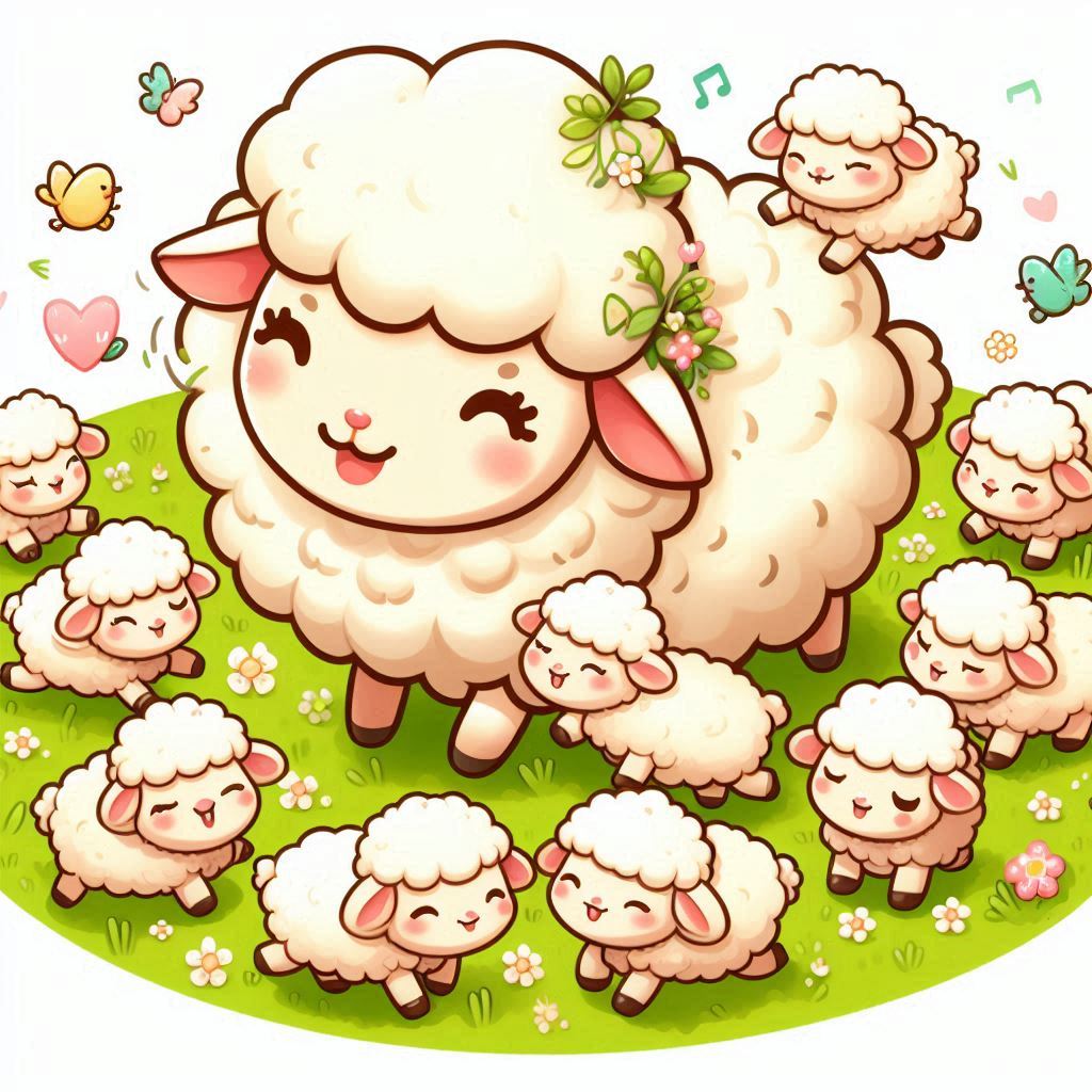 animal, baby, cartoon, cute, farm, field, flowers, fluffy, grass, green, happy, illustration, lamb, mother, nature, run, sheep, smile, spring, white