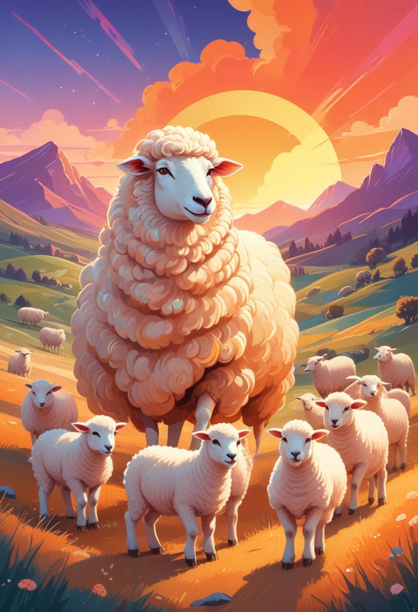 A large, fluffy sheep leads a flock of lambs across a grassy field as the sun sets behind the mountains.