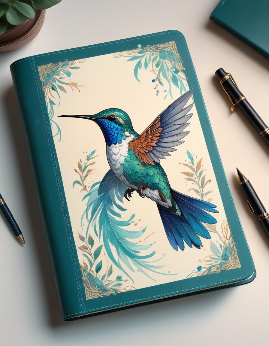 A teal notebook with a watercolor hummingbird illustration on the cover.