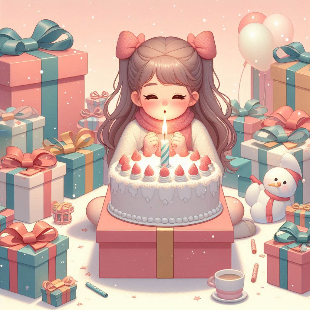 anime, art, birthday, blowing, cake, candle, cartoon, celebration, childhood, cute, digital, gift, girl, happy, illustration, joy, kawaii, out, presents, sweet