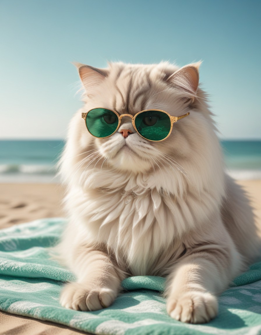 animal, beach, blue, cat, cool, day, enjoying, feline, furry, ocean, pet, relax, relaxing, sand, summer, sun, sunglasses, towel, vacation, white