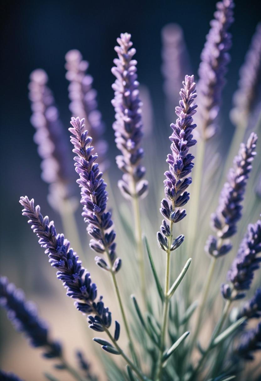 Close-up of lavender flowers blooming in a field, bathed in the warm light of the sun.