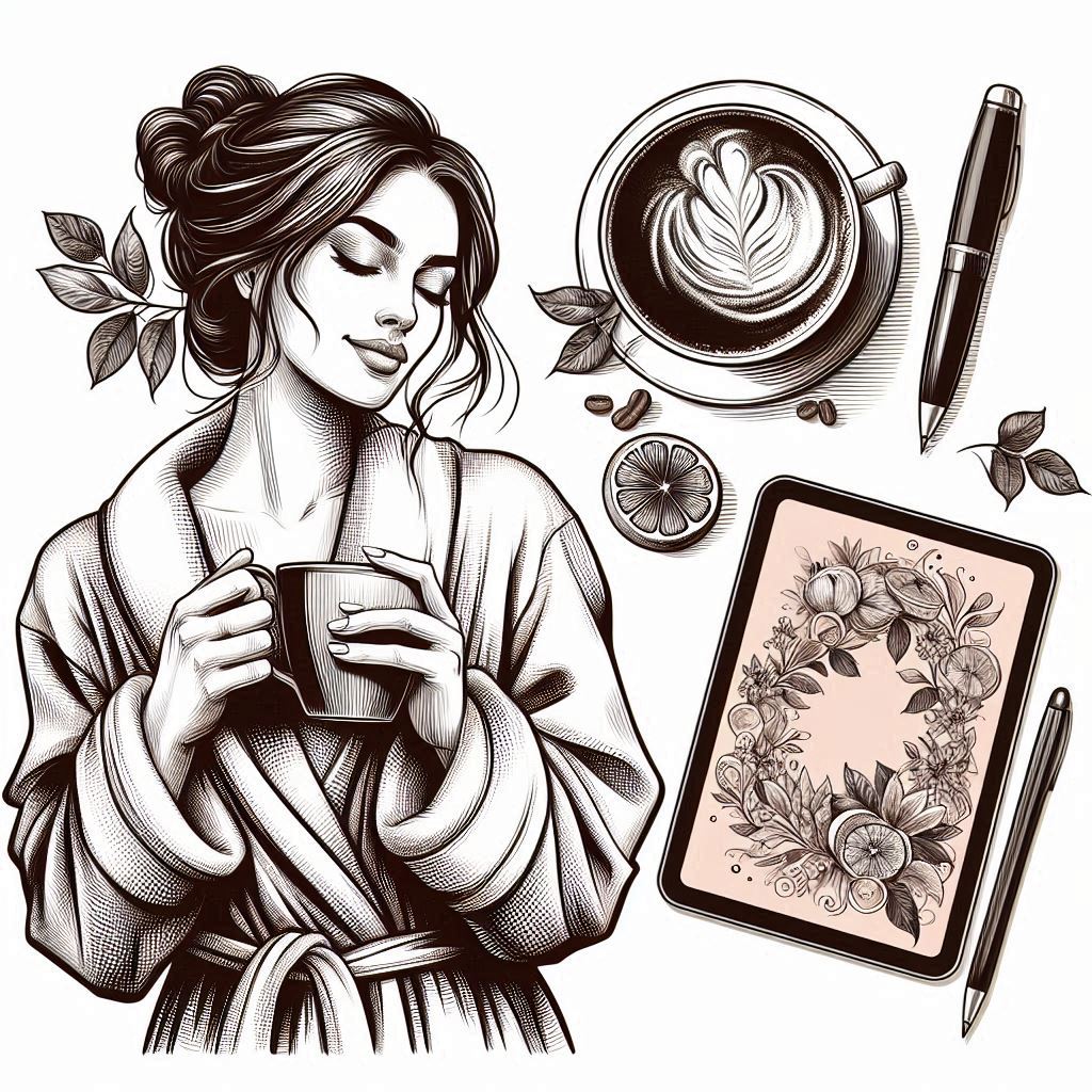 art, artwork, coffee, computer, cup, design, digital, drink, floral, illustration, latte, leisure, morning, pen, relax, robe, sketch, stylus, tablet, woman