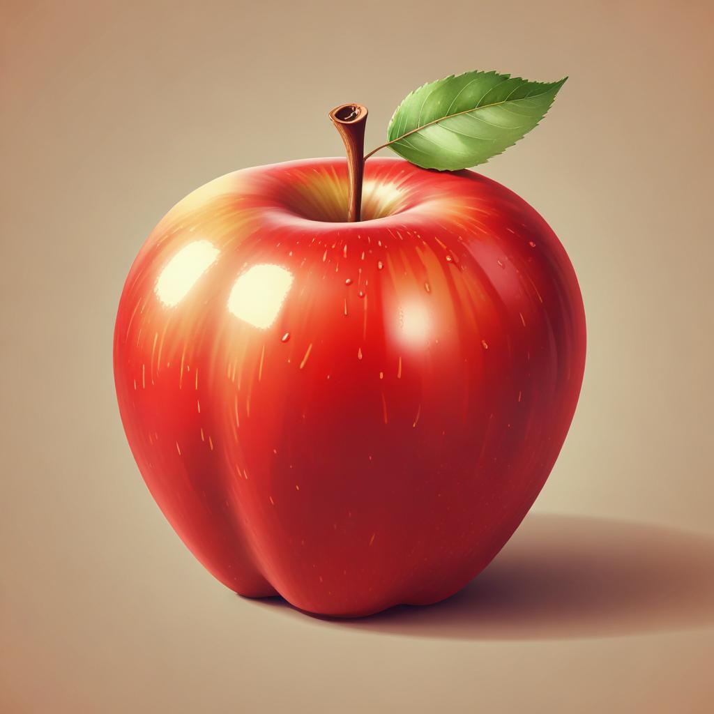 A single, red apple with a green leaf sits on a light brown surface.