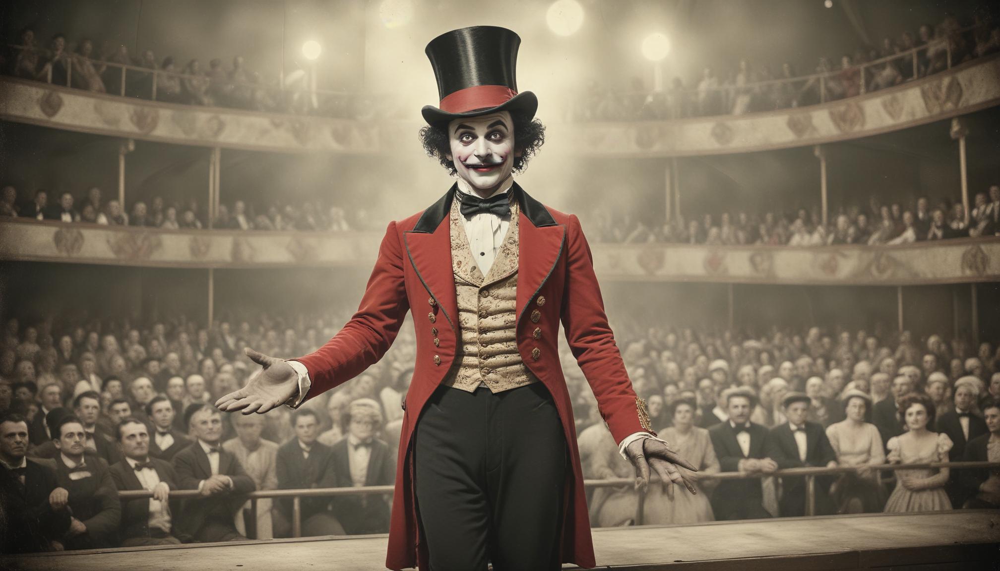 A ringmaster in a red suit and top hat stands before a crowd in a vintage theater, gesturing to the audience with a smile.