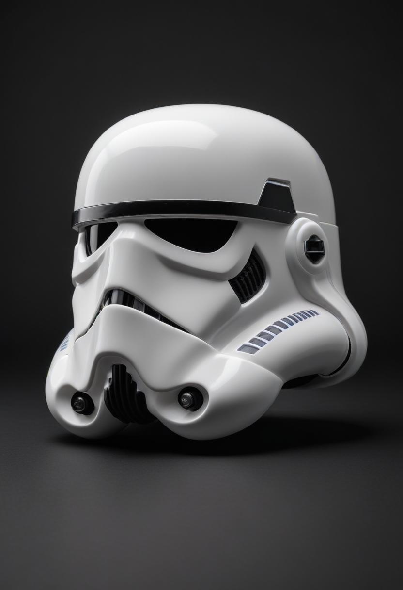 A white Stormtrooper helmet rests on a black surface, angled slightly towards the viewer.