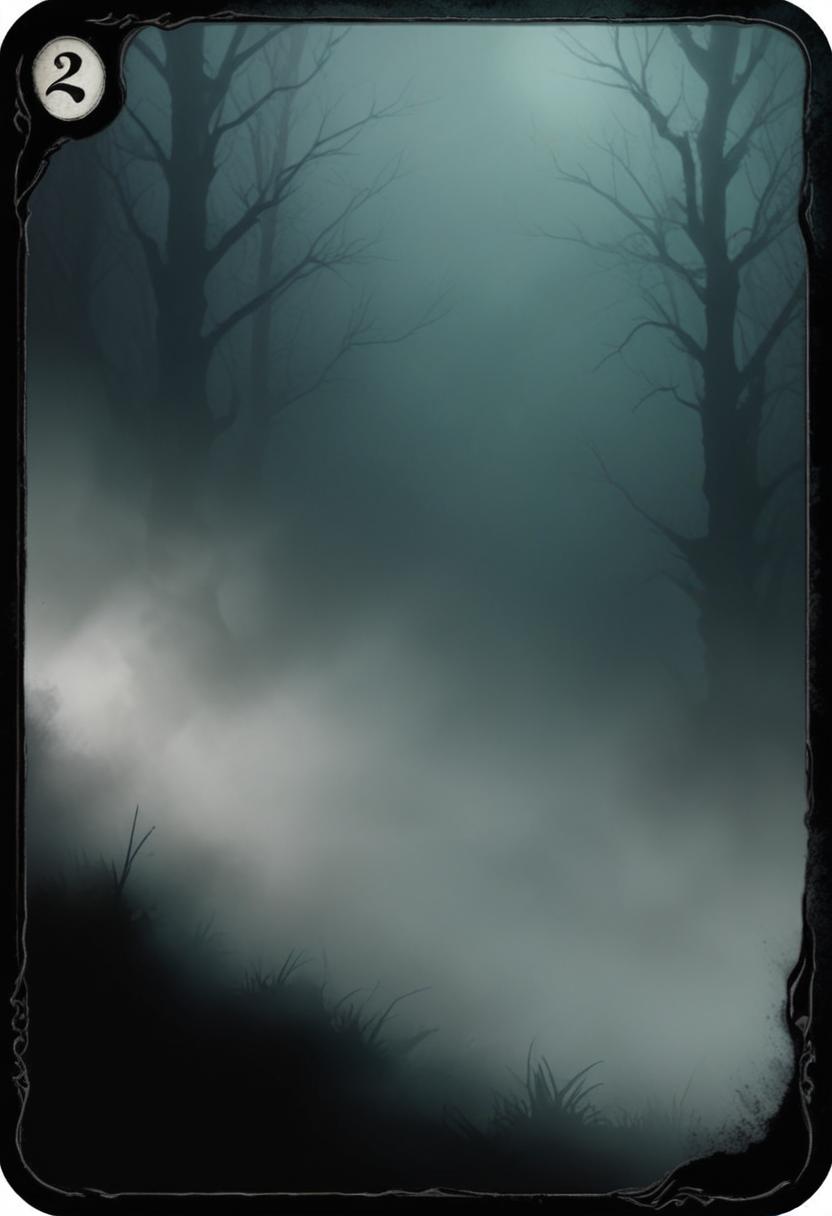 A moonlit path through a misty forest, with tall trees and a sliver of the moon visible in the sky.