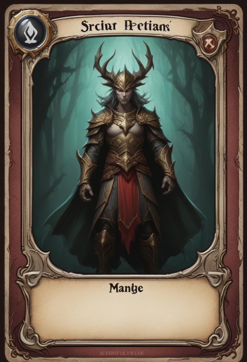 antlers, armor, art, artwork, background, card, character, creature, crown, dark, design, digital, fantasy, game, golden, green, illustration, manhye, petians, scruir