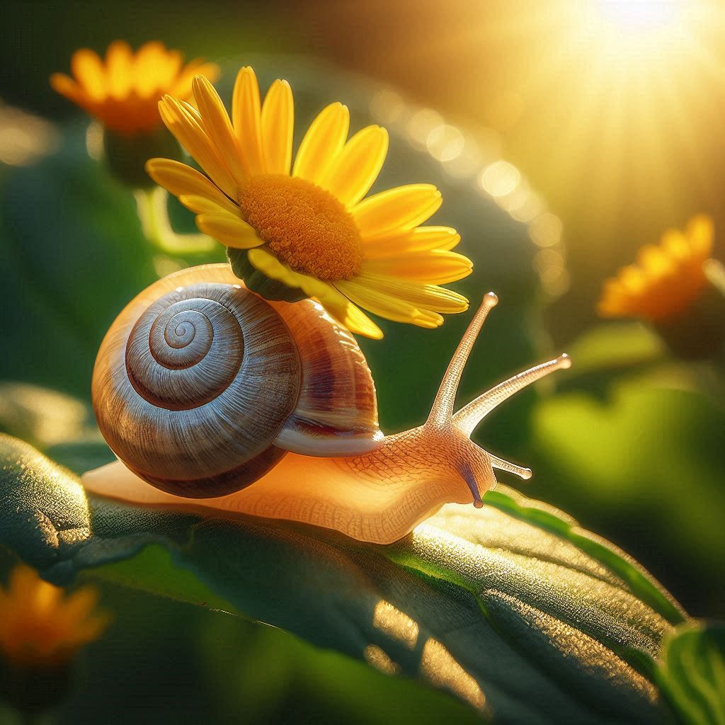 A snail crawls on a leaf with a sunflower resting on its shell in the sunlight.