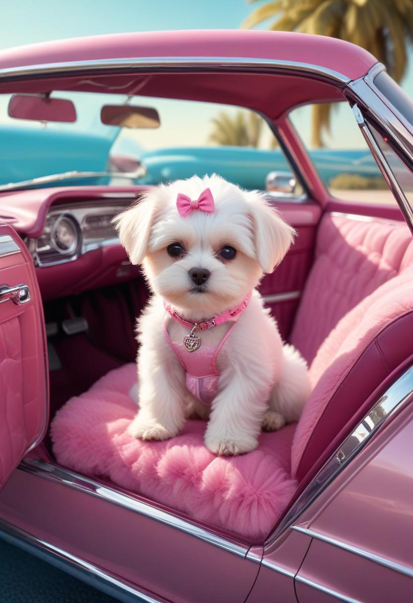 adorable, animal, bow, car, convertible, cute, dog, drive, fluffy, furry, passenger, pet, pink, puppy, seat, small, transportation, travel, vehicle, white