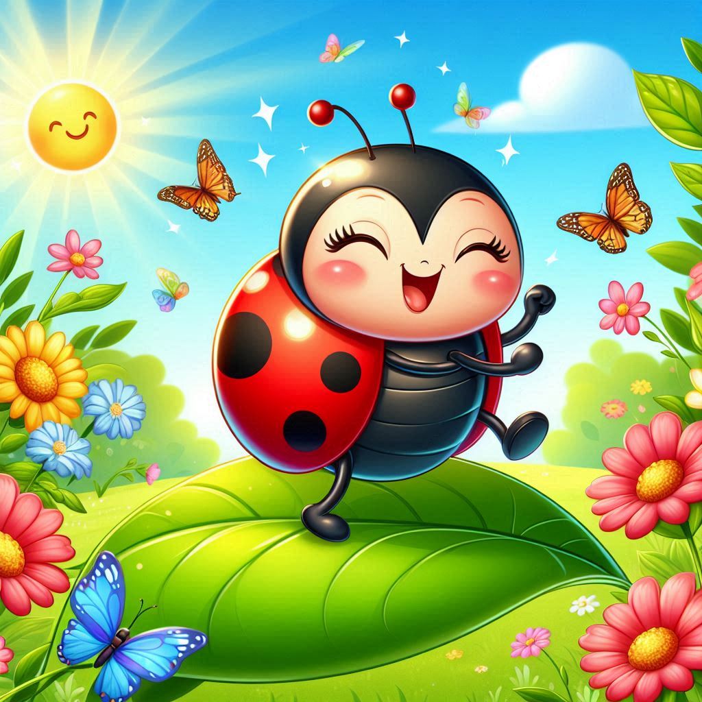 black, bright, cartoon, colorful, cute, flower, garden, green, happy, illustration, insect, ladybug, leaf, nature, red, smiling, spring, summer, sun, whimsical