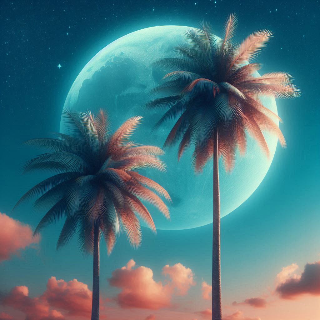 Two palm trees against a blue sky with a big full moon. Pink clouds on the horizon add warmth to the scene