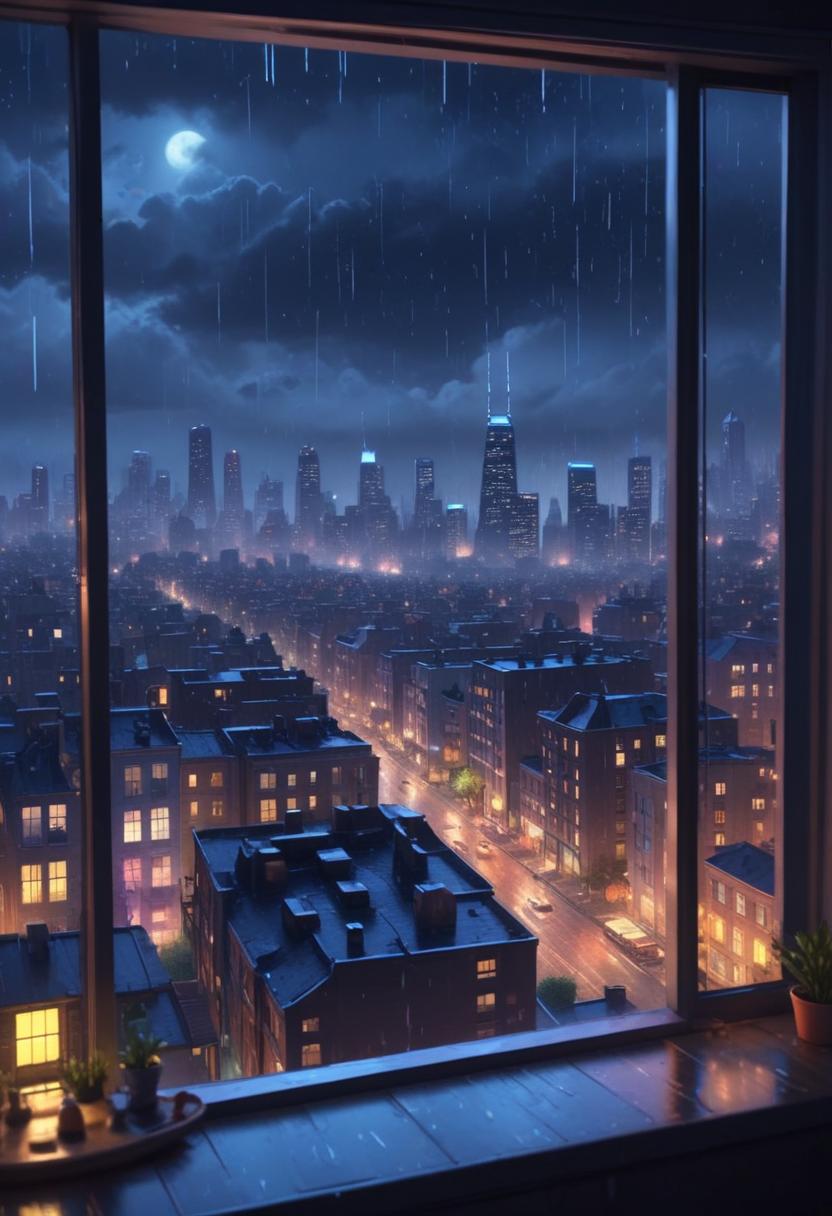 A nighttime cityscape with rain falling outside a window, the moon visible in the sky, and city lights illuminating the streets.