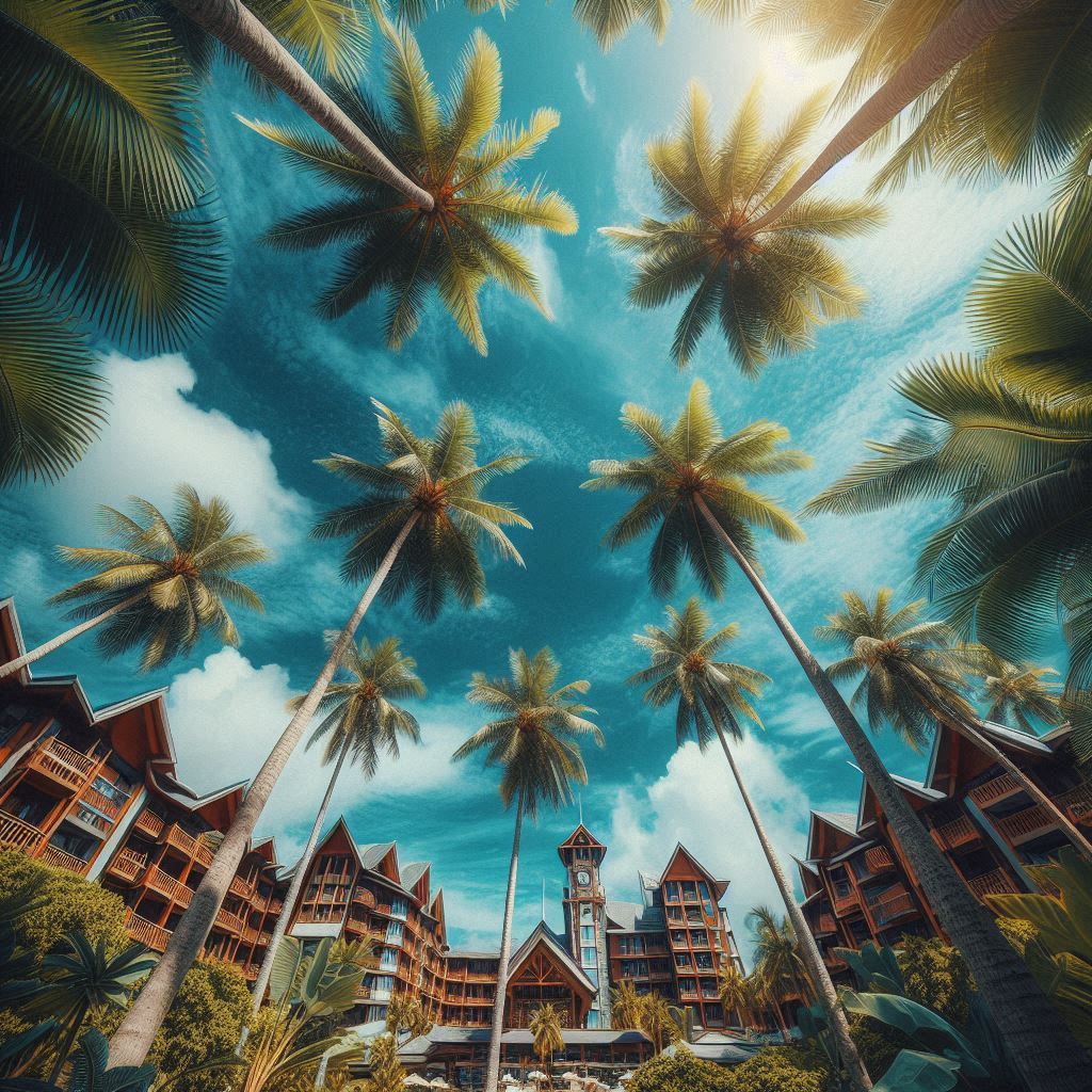 A tropical resort with a clock tower is seen from below, surrounded by tall palm trees reaching towards a bright blue sky.
