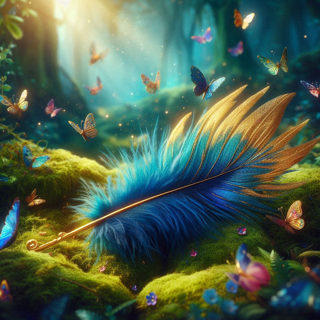A blue and gold feather lies on a bed of moss surrounded by flying butterflies in a sun-dappled forest.