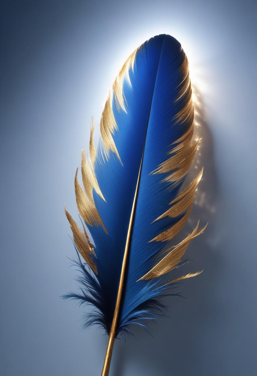 A single blue feather with gold accents is illuminated against a blue background.