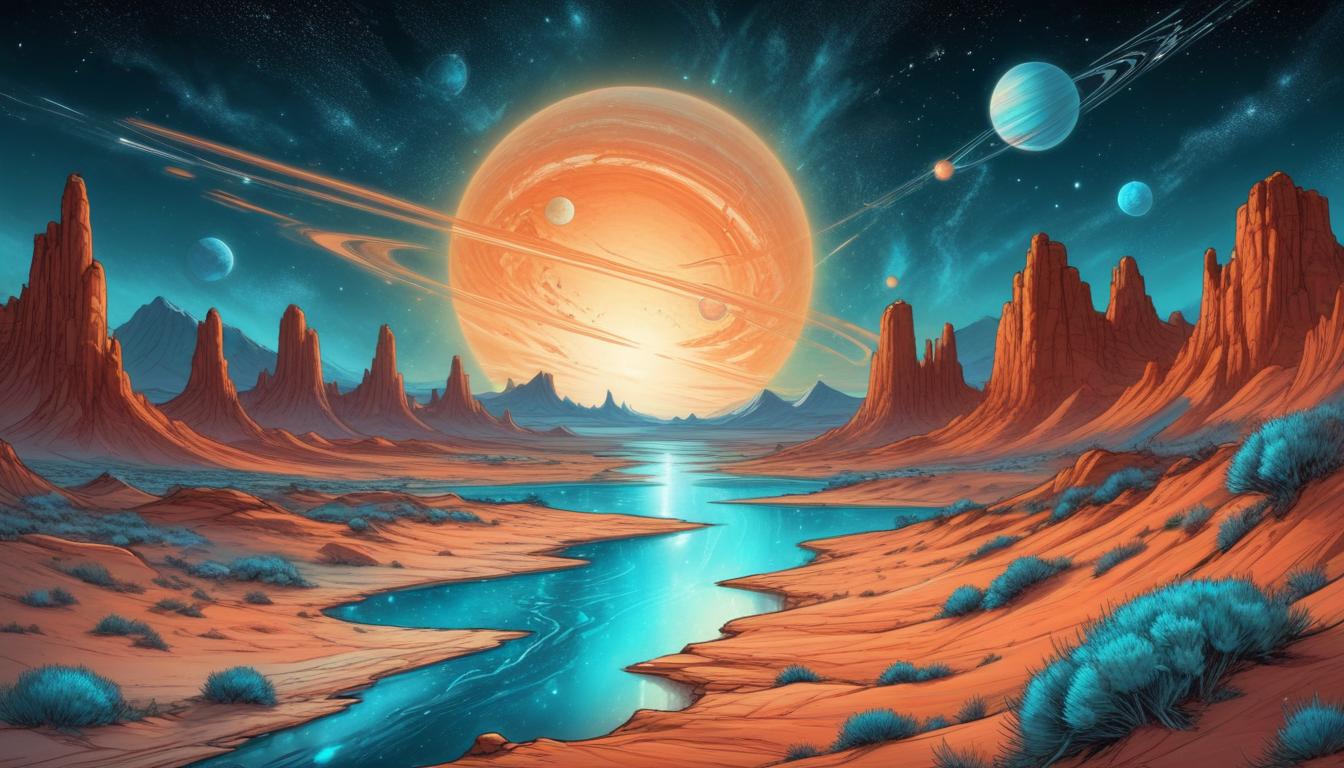 A river winds through a red-rock desert landscape under a starry sky, with a large planet and rings in the background.
