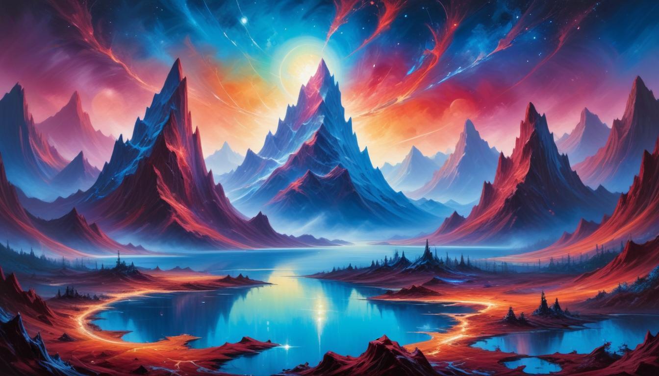 A vibrant landscape with towering mountains reflecting in a serene lake, all bathed in the colors of a setting sun.