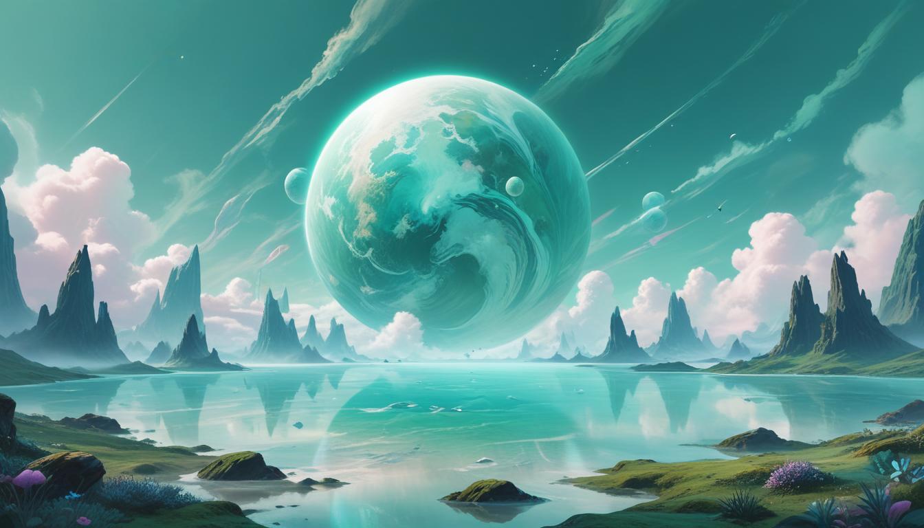 A green planet hangs in the sky above a still lake surrounded by towering mountains, with white clouds and a turquoise sky.