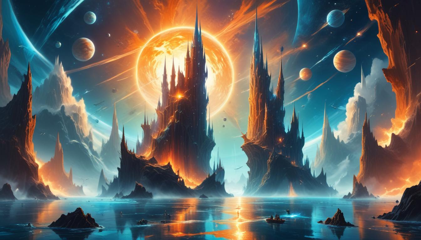A fantastical castle stands tall on a rocky island, illuminated by a giant red sun and surrounded by a starry sky with multiple moons.