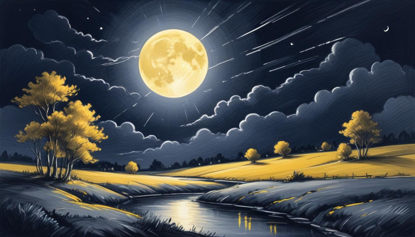bright, clouds, dark, field, full, landscape, moon, moonlight, moonlit, nature, night, peaceful, reflection, river, serene, shadows, sky, stars, trees, water