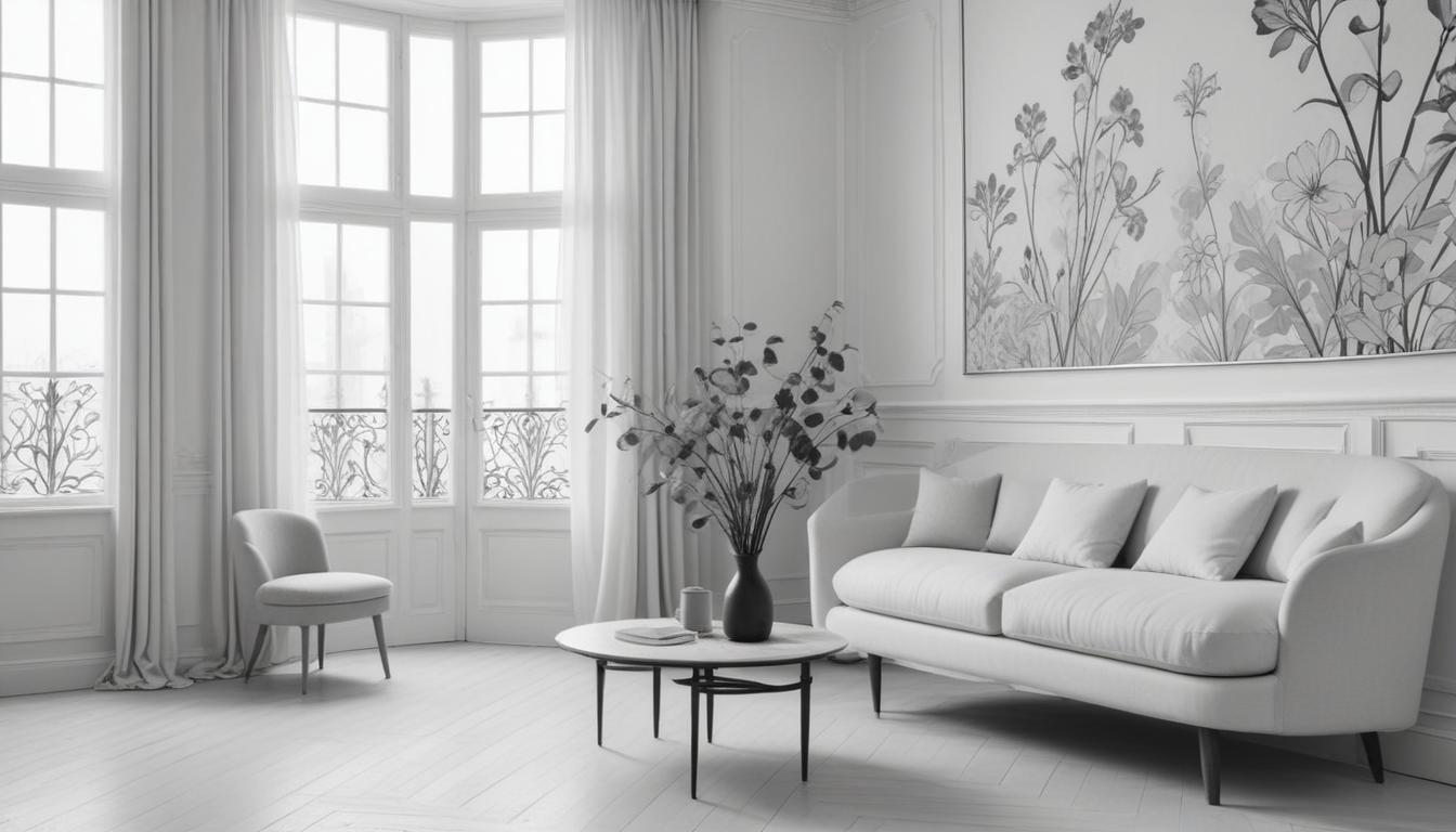 chair, coffee, contemporary, curtains, decor, design, floral, flowers, home, interior, living, minimalist, modern, print, room, sofa, table, vase, white, windows