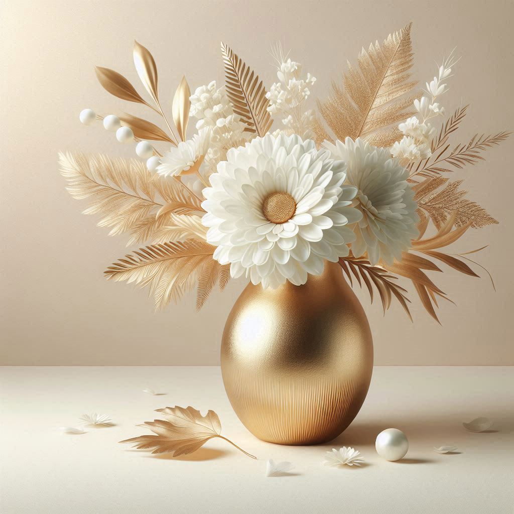 arrangement, art, botanical, decor, decorative, design, floral, flowers, foliage, gold, home, interior, leaves, life, petals, stems, still, table, vase, white