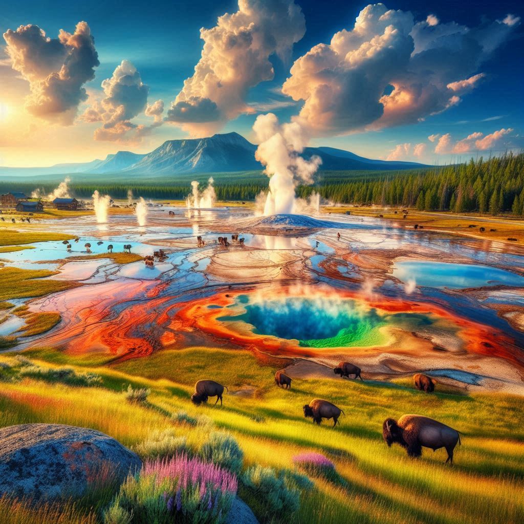 bison, blue, clouds, geyser, grass, green, hot, landscape, mountain, nature, orange, park, red, sky, springs, steam, travel, water, wildlife, yellow