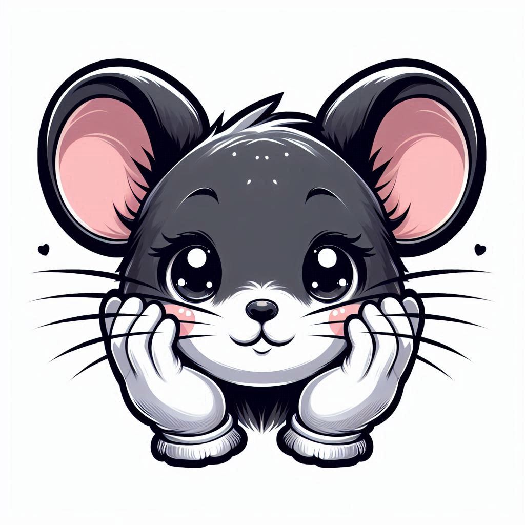 A cartoon mouse with large eyes and pink cheeks smiles and holds its hands up to its face.