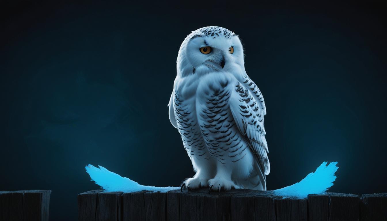 animal, background, beak, bird, blue, dark, eyes, feathers, lights, log, nature, night, owl, perched, predator, snowy, talons, white, wildlife, wings